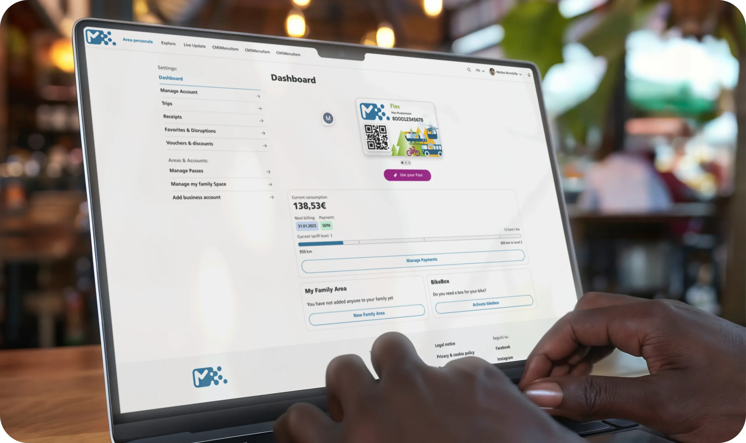 Ogni utente dispone di un'area personale per consultare i propri viaggi, ricariche, prenotazioni, preferenze e dati fiscali. È possibile esportare ricevute, attivare notifiche, modificare le credenziali e collegare più profili (es. genitori e figli o collaboratori).